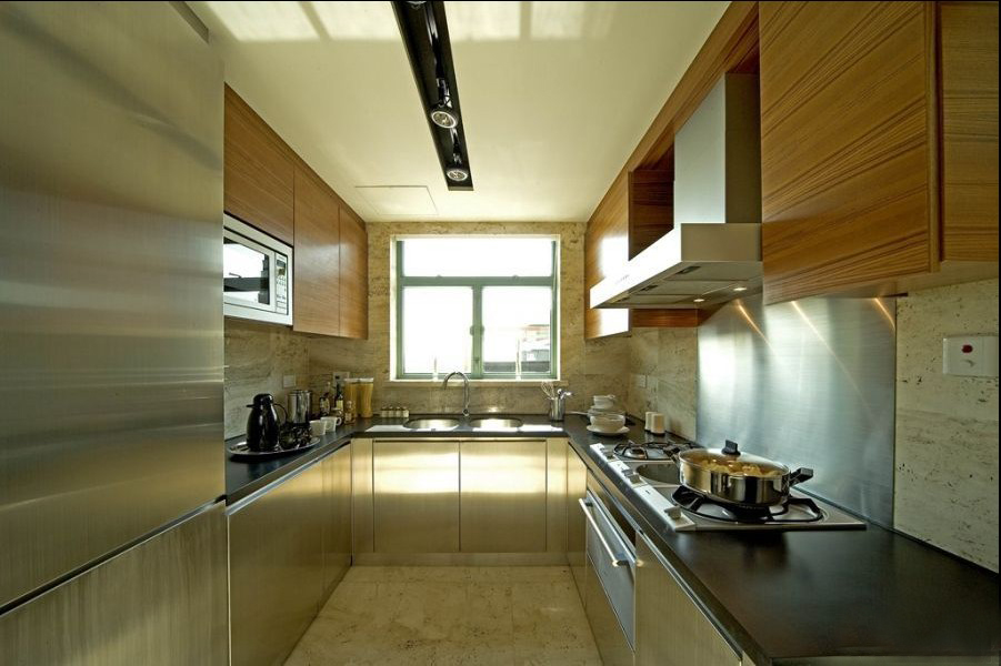 這個(gè)廚房櫥柜多用的不是常見的木質(zhì)面板,大面積的采用易清潔的不銹鋼,與深色的大理石臺(tái)面相互應(yīng)。雖然看著感覺冷冷的,但是對(duì)于經(jīng)常進(jìn)入廚房的主婦來說,這樣的廚房真是太可愛了,清潔上就會(huì)省去很多麻煩。
