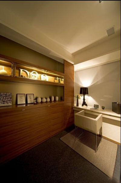 這個(gè)不常用的書房,線條簡潔至極。一塊式樣簡單的小塊地毯可以很好的緩沖這個(gè)空間的硬度。