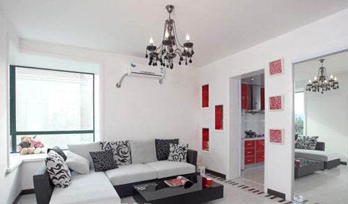 客廳與廚房之間的地面,用了很流行的琴鍵鋪法處理瓷磚。很有質(zhì)感的茶幾與黑色吊燈相互映襯。墻面紅色裝飾打破黑白冷艷的客廳,增加一絲暖意。