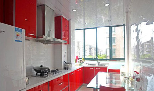 火紅的廚柜在白色瓷磚的襯托下分外艷麗。生活從此紅紅火火,哈哈!