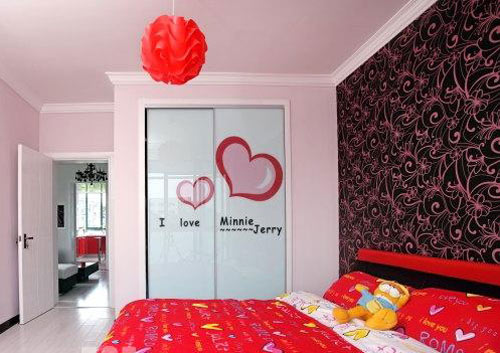 紅色為主色調(diào),充滿濃濃的喜慶和浪漫氣氛。如果你稍微留意,就會發(fā)現(xiàn)案例中到處有男女主人愛的表達,無論是心型的符號,還是英文的表達,都讓這個家充塞著兩人的愛意,這是兩人用愛營造的小屋。