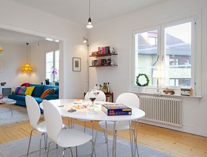 餐廳與客廳打通,客廳明艷的時(shí)尚色彩搭配。襯托出線條洗練的木質(zhì)餐桌和座椅,頗具北歐風(fēng)情,也讓整個餐廳看起來更加簡潔恬淡。桌上暖意色調(diào)的餐具,和亮麗的沙發(fā)區(qū)相映成趣,整個空間被拉進(jìn)一個活潑溫馨的氛圍中。