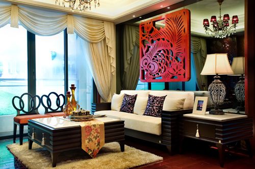 客廳沙發(fā)背景墻的剪紙藝術設計,室內裝飾品擺設著民間漆雕工藝,及琉璃和仿古家私都展示出中式風格設計風采。
