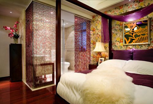 衛(wèi)浴間設計在臥室內,由玻璃和紫色珠簾隔開,白色的潔具與紫色珠簾的搭配看上去很美艷。純白和紫色的軟裝設計格調,凸顯出臥室的迷人和優(yōu)雅,嫵媚的感覺洋溢其中。