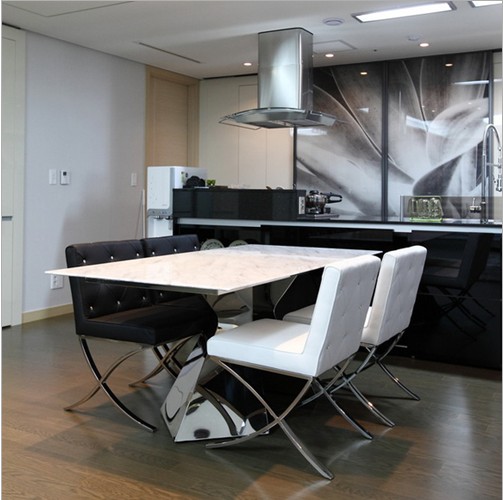 餐廳區(qū)域又是黑白銀的搭配,和家居設(shè)計(jì)保持連貫性和統(tǒng)一性。用大理石材料的白色飯桌,體現(xiàn)家居的奢華,低調(diào)又有格調(diào)。以黑白表情呈現(xiàn)開放餐廳的簡(jiǎn)約意象,與全屋設(shè)計(jì)同元素的材質(zhì)呈現(xiàn)一氣呵成的連貫感受。