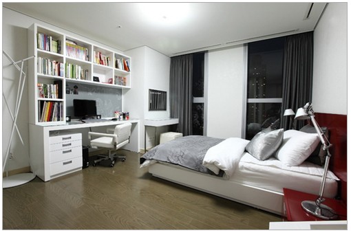 銀色的抱枕、灰色的被套、深灰色的窗簾使寢室和客廳的設(shè)計(jì)保持連貫性。搭配酒紅色的床頭板,透露出一絲女性的性感特色。臥室內(nèi)書柜和書桌的二合一,節(jié)省空間,也讓生活更加便利。書柜旁邊的衣帽架,線條設(shè)計(jì)特別,為空間增添了另外一種的線條層次,同時(shí)和床頭的不規(guī)則書柜相互輝映,相互呼應(yīng)。