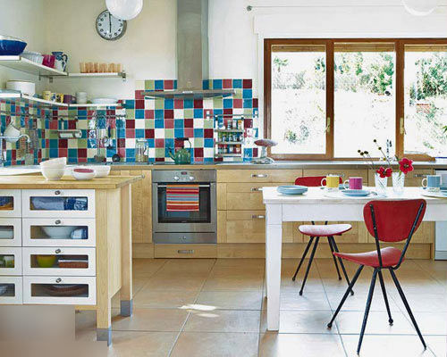 原木色和白色搭配的廚柜,給人整體淡然的設(shè)計感;整潔的流理臺面帶給人以高品質(zhì)的追求;櫥柜臺面的彩磚背景墻營造出豐富的空間層次感。