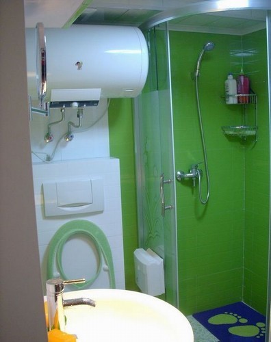 衛(wèi)浴間在色彩上與其他房間有些出入,瓷磚是白色和綠色相間,色調(diào)上選用了淡綠色春意盎然的感覺。