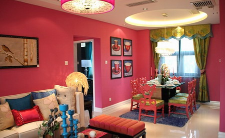 粉紅色給人以溫暖、放松的感覺,適宜在客廳里使用。如地板用柔和的粉紅色,然后在選用同色的布藝靠墊以及粉紅色印花的窗簾,在白色的沙發(fā)、米黃色墻的襯托下,再加點兒淡藍色,就會形成花壇般的羅曼蒂克格調,頗適合年輕人的品位。
