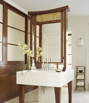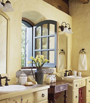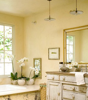 掉漆的浴室柜呈現(xiàn)出原始狀態(tài)的造型,卻正是它使鄉(xiāng)村風格的衛(wèi)浴間拋開一切現(xiàn)代工業(yè)所帶來的束縛感,搭配藤質(zhì)的天然材料,帶給浴室一種溫馨舒適的感覺。