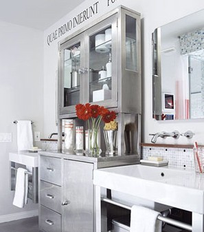 亮光的不銹鋼浴室柜搭配同樣高亮的白色潔具,相同的質(zhì)感為浴室?guī)砜釀攀愕膫€性元素;同時花卉的點綴能中和空間里的冰涼感。