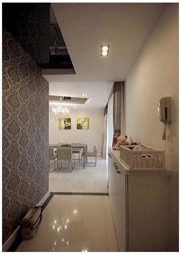 一個(gè)現(xiàn)代感極強(qiáng)的家居門廳,可以采用一些能表達(dá)時(shí)尚、前衛(wèi)的壁紙?jiān)氐?。白色的瓷磚與棕色的印花壁紙,會(huì)給空間帶來無限前衛(wèi)而又寫意的趣味。同時(shí),一個(gè)線面流暢的現(xiàn)代感十足的鞋柜,既滿足了門廳的功能需要,又與門廳的風(fēng)格極為協(xié)調(diào)匹配。