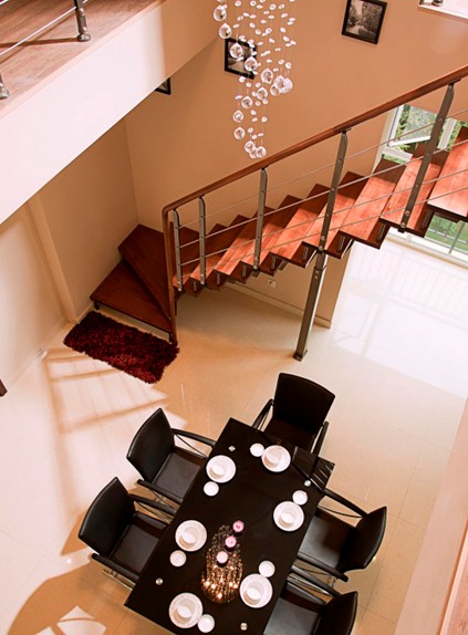 餐廳的燈用數(shù)量來打造餐飲空間的細(xì)膩?zhàn)兓?;黑色的餐桌、白色的餐具、下垂的乳白色的工藝燈,簡單而具大手筆;
