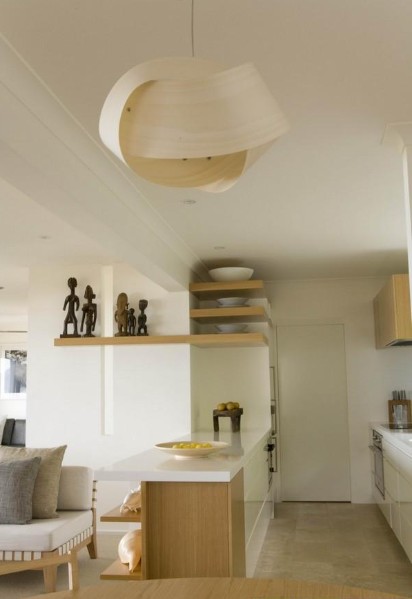 這踏踏米式的沙發(fā),在這個半開放式的廚房吧臺旁邊,餐桌在另一角,轉(zhuǎn)角過道都設計成了柜子做為收納空間。