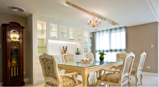 歐式中的白色家具是所有裝飾中比較洋氣的,也是比較討巧的裝飾,白色是神圣典雅的;白色大尺寸石膏頂角線條,局部白色吊頂燈帶,具有不對稱的美感;