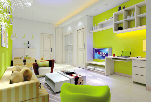 考慮房主是年輕活潑的女孩,明庭中采用活潑明亮的主色調,把電視背景墻刷成果綠色。其余的功能也在這面墻上做文章:上邊設計了裝飾柜,緊鄰小電視柜旁邊再并排放書桌。空間利用充分、有序。