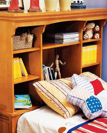 床頭柜運(yùn)用式的儲(chǔ)物柜,可以存放些孩子日常要看的書本和玩具。大大增加來收納功能。