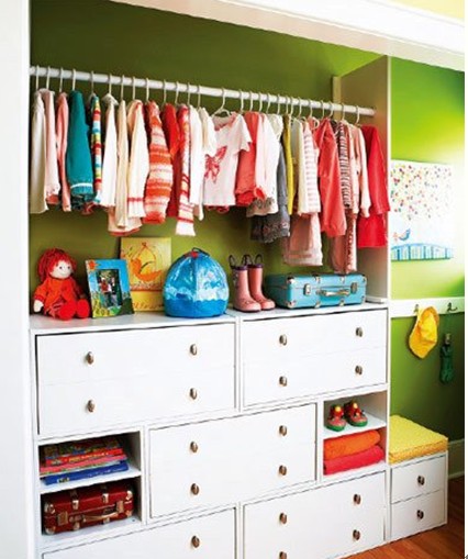 兒童房的衣柜可以擯棄傳統(tǒng)的顏色,粉刷些明快的顏色作為基調(diào)。這樣看上去更有開闊感又增加來儲(chǔ)物空間。這種組合式的柜體還可以根據(jù)收納需要調(diào)節(jié)抽屜和擱板的位置。低處設(shè)置了掛桿掛放衣物,下面的小柜子可以放鞋,背包或者帽子等外出用品則可以整齊地掛在掛鉤上。
