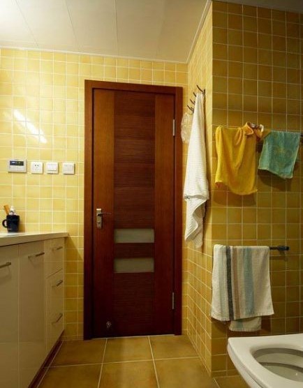 衛(wèi)生間里的墻磚和地磚統(tǒng)一顏色,均為復(fù)古磚。淋浴房和盥洗區(qū)分別用藍(lán)色和黃色瓷磚區(qū)分開(kāi)來(lái),使得空間區(qū)域隔斷明顯,容易辨認(rèn)。干濕分區(qū)對(duì)家庭主婦來(lái)說(shuō)太重要了。