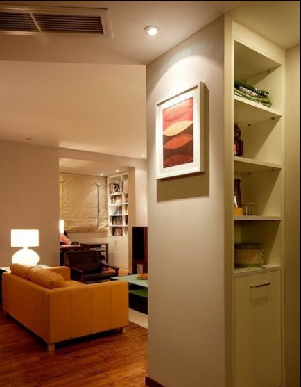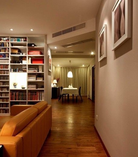 客廳里家庭影院當(dāng)然是必不可少的了,桔色的布藝沙發(fā)暖意洋洋,可以想像一家人坐在上面看春晚的情形吧。