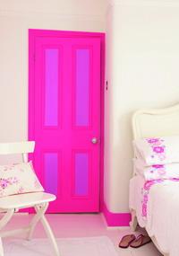 Pattern 3舊貌新顏 一反過(guò)去彩色墻壁搭配白色木制家具的風(fēng)格,我們可以把門和木制品用絢麗奪目的色彩裝扮,再配上純白色的墻壁,新意別出。選用亮粉色涂刷門、門框和踢腳板,用淡紫色涂抹內(nèi)門嵌板來(lái)搭配,這是使用鮮亮色彩涂刷房間的一種巧妙創(chuàng)意,不必刷一整面特色墻壁,卻能達(dá)到同樣亮眼的視覺(jué)效果。
