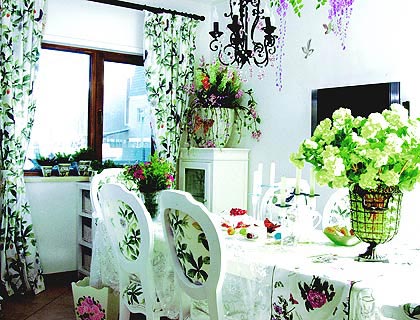 餐廳的椅子和窗簾是定做的,椅背上的花紋和窗簾的圖案遙相呼應(yīng)。