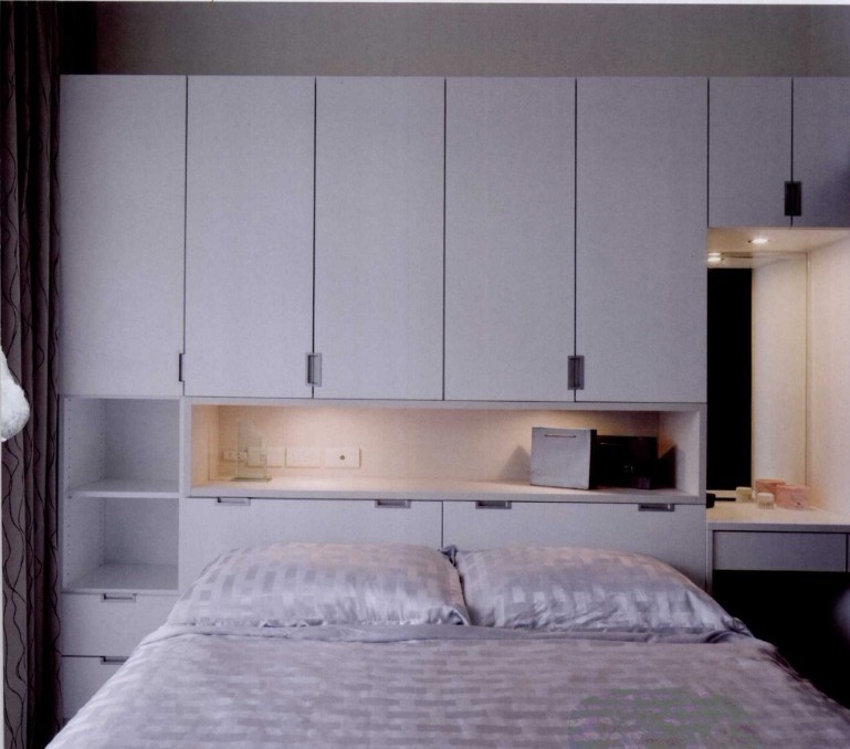 將通往走道的畸零空間規(guī)劃為更衣室,兩側(cè)必須有足夠的收納空間,系統(tǒng)柜依照更衣室的狹長(zhǎng)型設(shè)計(jì)成L形,充分發(fā)揮狹小空間的收納潛力。