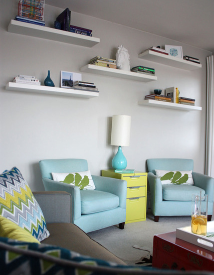 客廳除了灰色,藍(lán)色和黃色是家具選擇的重點(diǎn),長沙發(fā)用深一點(diǎn)的灰色,單人沙發(fā)和收納柜則分別選用了長沙發(fā)抱枕上的藍(lán)色和黃色相同的顏色讓客廳的灰色、藍(lán)色和黃色巧妙地展現(xiàn)同一個(gè)主題。墻壁上加上置物板,活用上層的空間,同時(shí)也能讓設(shè)計(jì)更加立體,呈現(xiàn)多種線條和顏色的變化。