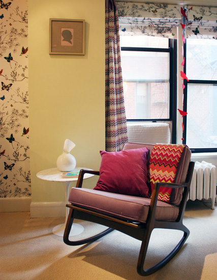 用灰色線條加上五顏六色的蝴蝶裝飾的壁紙將米白色的嬰兒房墻壁營造出清新自然又開闊的空間。加上黑白波浪花紋的地毯,將平面變成立體的設(shè)計(jì),增加顏色和設(shè)計(jì)的層次。書柜里側(cè)的藍(lán)色則保持了客廳和寢室顏色上的聯(lián)系。