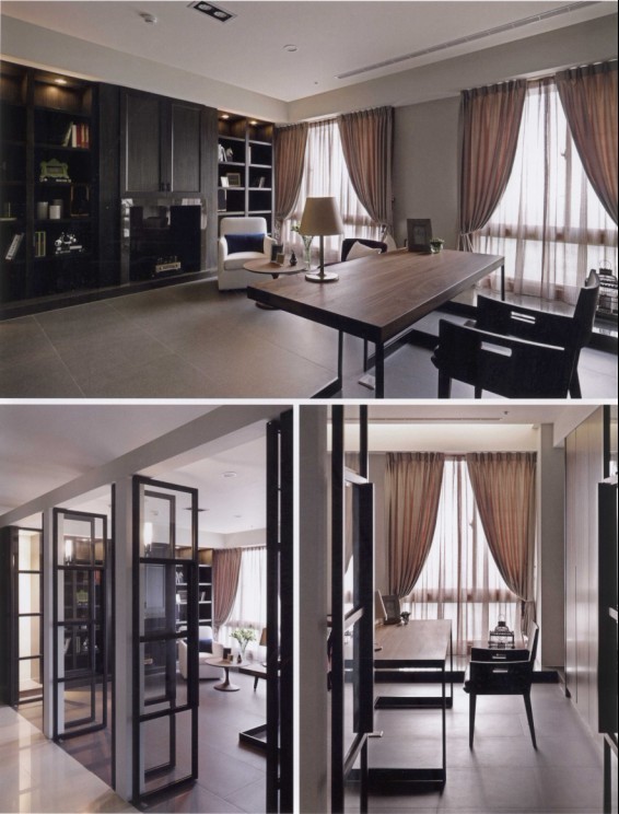 考量到未來(lái)使用性,將三房中的一房放大作為書房。深色基底以淺色軟件為主軸,構(gòu)筑出開放式書架造型,輔以奢華卻線條極簡(jiǎn)的壁爐,創(chuàng)造出美式現(xiàn)代感的書房空間,也讓屋主音響收藏有了適當(dāng)?shù)陌才拧?/p>