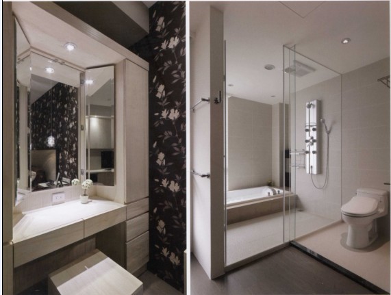 很少人家會(huì)在衛(wèi)生間的地面用地板,這家卻是,因?yàn)樗嬲龅搅烁蓾穹謪^(qū)。每一個(gè)可能占到水的部分都以巧妙挑高的手法分隔開來(lái),既能美化空間,又實(shí)用之及。