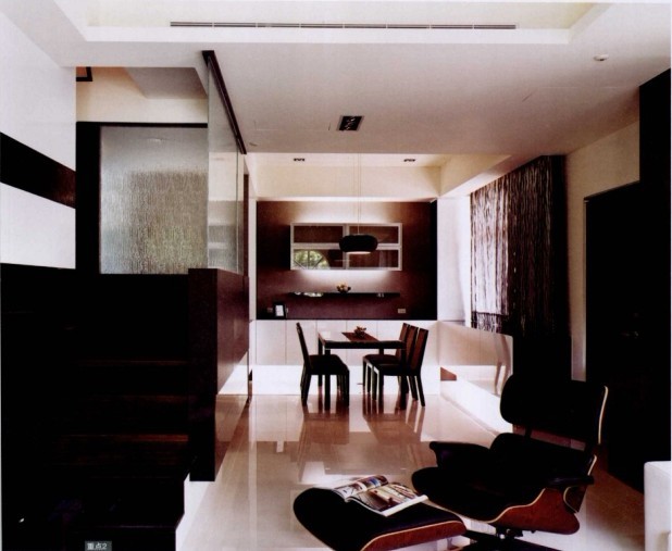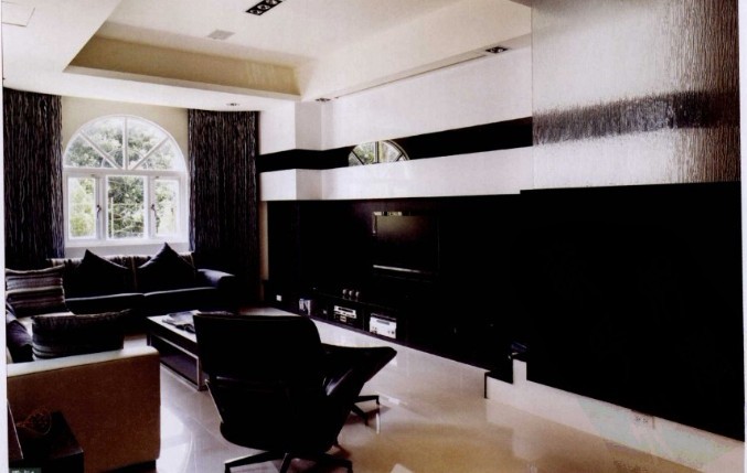 客廳常是家人聚會(huì)、娛樂(lè)的空間,所以客廳的設(shè)計(jì)包含卡拉OK機(jī)、投影機(jī)、銀幕與其他影音設(shè)備的安排。選擇定制家具并以局部開(kāi)放及陷落的設(shè)計(jì),將視聽(tīng)設(shè)備整齊收納,客廳因而顯得寬敞、大氣。