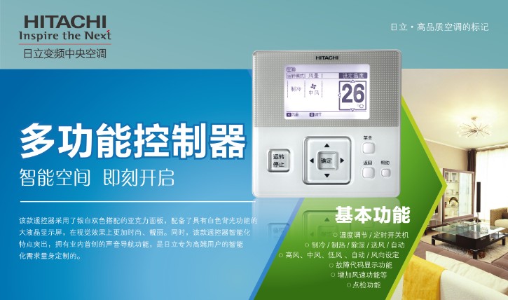 日立多功能控制器是業(yè)界首個具備聲音導航功能的智能遙控器,語音功能啟動后,控制器可用聲音通知設定內(nèi)容。它配備白色背光的大液晶顯示屏,視覺效果時尚靚麗,全點式畫面,一目了然。除具備如溫度調(diào)節(jié)等基本功能外,日立多功能控制器具備還可設定每日5次啟停來適應您的生活節(jié)奏、避免溫度過低和過高設定而造成能源浪費等多個智能易用的操控功能。日立中央空調(diào)多功能控制器大小事一手把握,為家庭用戶提供完善的操作需求。