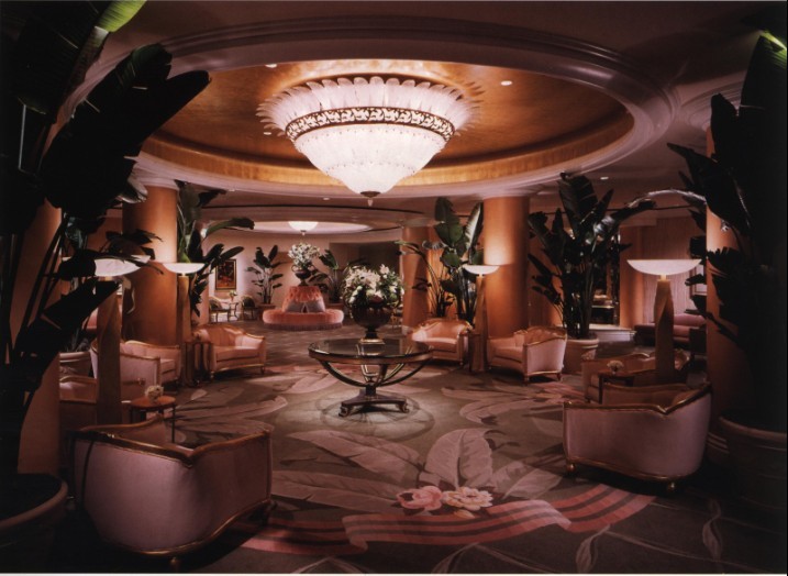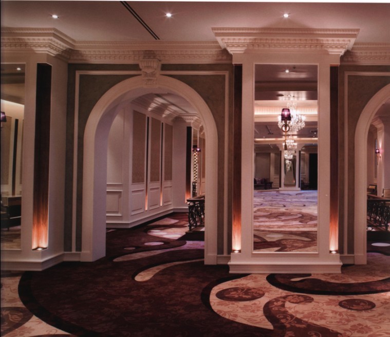 如宮殿般高貴的拱門設(shè)計、精致的吊頂、諾大的水晶燈……對于相對開闊的公共空間而言,大面積地鋪設(shè)地毯能夠渲染出大氣、高檔的空間氛圍。尤其是采用大面積的圖案和濃重的色彩來渲染地毯的裝飾效果,更加能夠突出軟裝飾的意味,進(jìn)而給人留下深刻的印象。