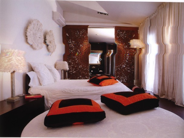拿走臥室里幾個(gè)顏色鮮艷的靠墊,這個(gè)臥室里似乎少了一些生氣,過于空靈??臻g的主體陳設(shè)物采用白色作為主色調(diào),突出柔和、純潔的視覺感受,與其相搭配的靠墊和隔斷卻采用了鮮艷的色彩,以便形成一種色彩上的對(duì)比和反差,進(jìn)而給人們以視覺的刺激。