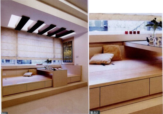 陽臺外推成休憩區(qū),而架高的平臺下方則利用抽屜及上掀式門片設(shè)計成收納柜,連柱間也規(guī)劃收納空間,讓空間更為整潔。