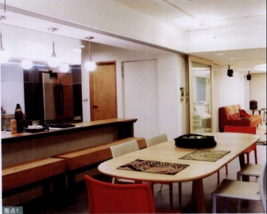 以日式居酒屋為概念設(shè)計(jì)的廚房吧臺(tái),讓屋主可以邊下廚連跟朋友聊天??紤]到廚具以不銹鋼為主,為化解冰冷感,特別以紅色來中紅。而廚房的電器,都以嵌入為主。
