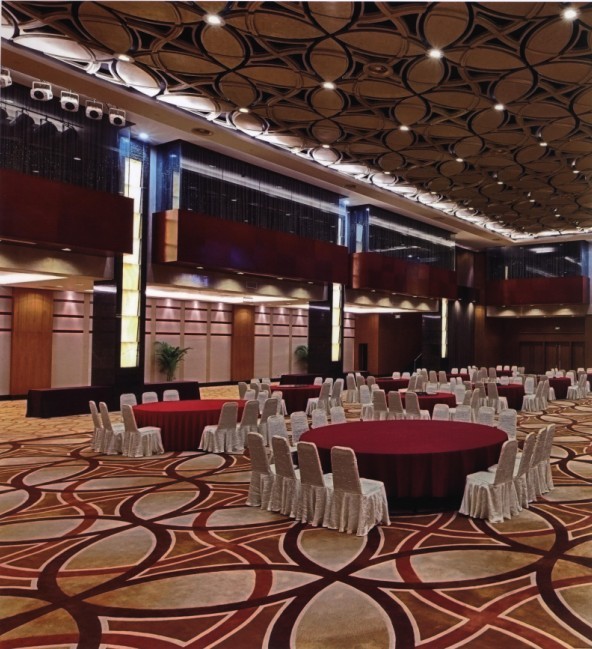 在這個(gè)酒店大廳的項(xiàng)目設(shè)計(jì)中,酒店宴會(huì)廳里內(nèi)部裝修以厚重暖色調(diào)來(lái)襯托莊重感。地毯圖案的設(shè)計(jì)與棚頂?shù)脑煨蛨D案相一致,形成空間上的視覺(jué)效果,使空間成為統(tǒng)一的整體,同時(shí)形成強(qiáng)烈的視覺(jué)沖擊。