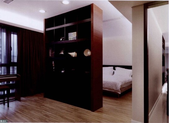 主臥更衣室與主臥中間用一雙面柜子區(qū)隔,一面是染紅木皮的電視墻,而另一面的染黑木皮的展示柜,規(guī)矩的格子造型讓黑色增加許多變化卻不失穩(wěn)重。