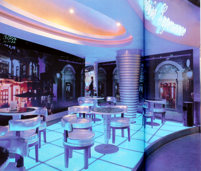 幾乎所有表現(xiàn)科技主題的室內(nèi)空間都少不了藍(lán)色。但是有人說,藍(lán)色代表的科技是工業(yè)社會的科技,它象征的是龐大的機(jī)械和高速運(yùn)轉(zhuǎn)的流水線。而在后工業(yè)化的時代,甚至對于更深遠(yuǎn)的信息時代,科技的意義已經(jīng)遠(yuǎn)遠(yuǎn)超越了物化的機(jī)械而轉(zhuǎn)向非物質(zhì)的信息表達(dá)和更有機(jī)的人文關(guān)懷。