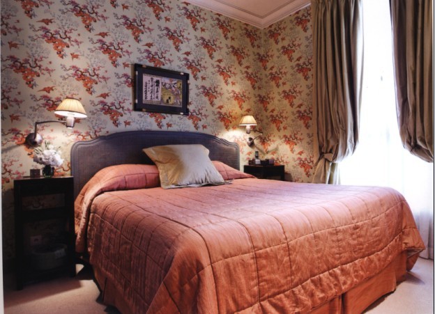 這個美式大戶型的臥室,在空間的裝飾設(shè)計中,色彩是表現(xiàn)床的突出元素,為了與墻紙的圖案相搭配,床被的色彩采用了暖色調(diào),在烘托出空間溫暖的氛圍的同時,也能夠給人以視覺上的沖擊,從而起到裝飾的效果。