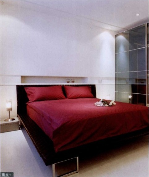 主臥與更衣室屬于狹長格局,因?yàn)閮蓚€(gè)空間互通,因此刻意設(shè)計(jì)一面斜墻讓臥室的面積變大,同時(shí)選擇藍(lán)色鏡面玻璃拉門作為更衣室門片,當(dāng)更衣室內(nèi)燈關(guān)閉時(shí),借由鏡面反射加大臥室空間。