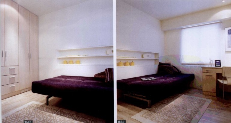 書房、更衣室與小朋友房間都選用定制家具,既節(jié)省了施工時(shí)間 ,又省下木作費(fèi)用,同時(shí)也滿足收納需求。墻面上的木架裝飾,成為小件裝飾品的置放地,為白色墻面減掉空白,為空間增加一些趣味。