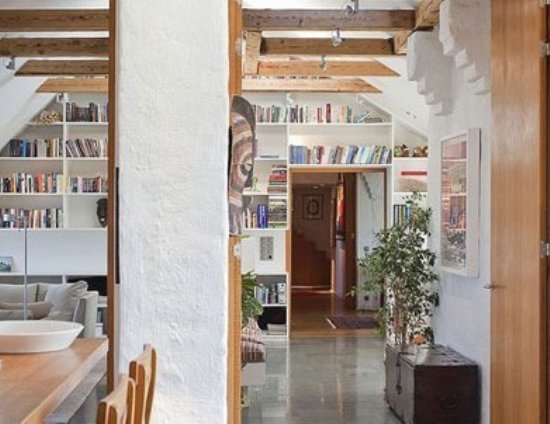 橫穿客廳的背景墻滿是白色木板切割出的開放型擱架,貼墻設(shè)計(jì)的超大容量書架有意讓書成為空間里最重要的裝飾,同時(shí)它的收納能力也在客廳里起著不可忽視的作用。而造型簡(jiǎn)單、質(zhì)感輕巧的置物架也不會(huì)讓客廳整體產(chǎn)生擁擠感。
