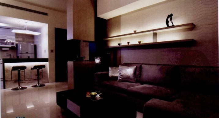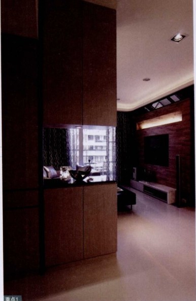 以深色仿鱷魚皮壁紙包覆玄關(guān)柜,并延伸至沙發(fā)主墻。特別設(shè)計的層板不只作為裝飾,同時也是收藏品的展示空間,再打上燈光,產(chǎn)生了意想不到的效果。