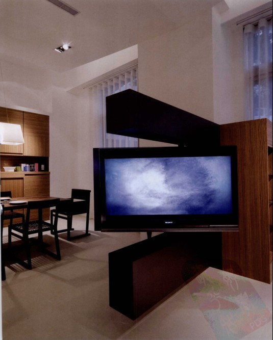 為維持開(kāi)放式的空間感,設(shè)計(jì)師特別規(guī)劃了旋轉(zhuǎn)式的電視柜,讓客廳與餐廳都能看電視。造型突出的開(kāi)放柜,不僅僅可以用來(lái)收納客廳的視聽(tīng)音響設(shè)備。又成為客廳最搶眼的裝飾展示柜。