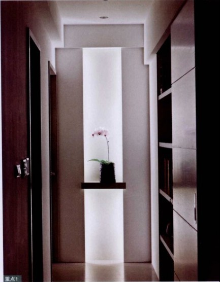 運(yùn)用冷暖顏色的比例對(duì)稱(chēng)及三比一高度的線(xiàn)條切割,將空間中的多元元素整合。設(shè)計(jì)師在客廳前方規(guī)劃書(shū)柜,在走廊盡頭設(shè)計(jì)觀(guān)景臺(tái),可擺放業(yè)主的收藏品,打造一方休憩的過(guò)渡場(chǎng)所,也增加了家里的收納功能。