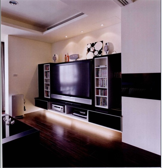 客廳電視柜采用黑白對(duì)比的色調(diào)設(shè)計(jì),雙層可移動(dòng)式的收納柜在家具廠定制設(shè)計(jì)而成??梢允占{家里大量的影音收藏品。電視柜下方的間接光源,使得整體感不會(huì)太過(guò)沉重。