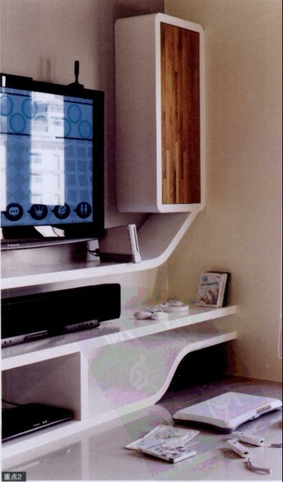 喜歡視聽的業(yè)主,CD 、DVD片的數(shù)量絕對不會少。設(shè)計師在電視墻上規(guī)劃造型展示層架,不但收納功能不減,也兼顧了美感,而下方的開放柜則用來收納游戲機(jī)。