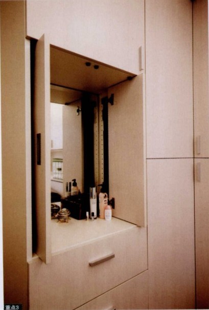 受限于空間大小,主臥沒(méi)有另外隔出更衣室,而女主人希望所有雜物都能夠收得干干凈凈。設(shè)計(jì)師在床頭板及左側(cè)墻面規(guī)劃了衣物收納柜,化妝臺(tái)也以所推拉式隱藏其中。